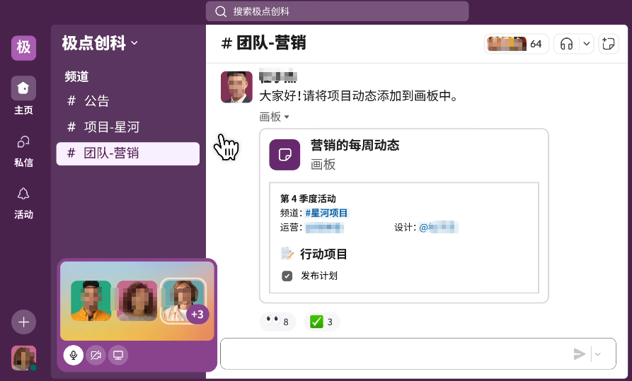 频道让工作变得有序且清楚,你可以为每个项目、主题或团队创建频道。频道可以处理各种事项时,你就可以集中精力处理对你来说最重要的对话和工作。
